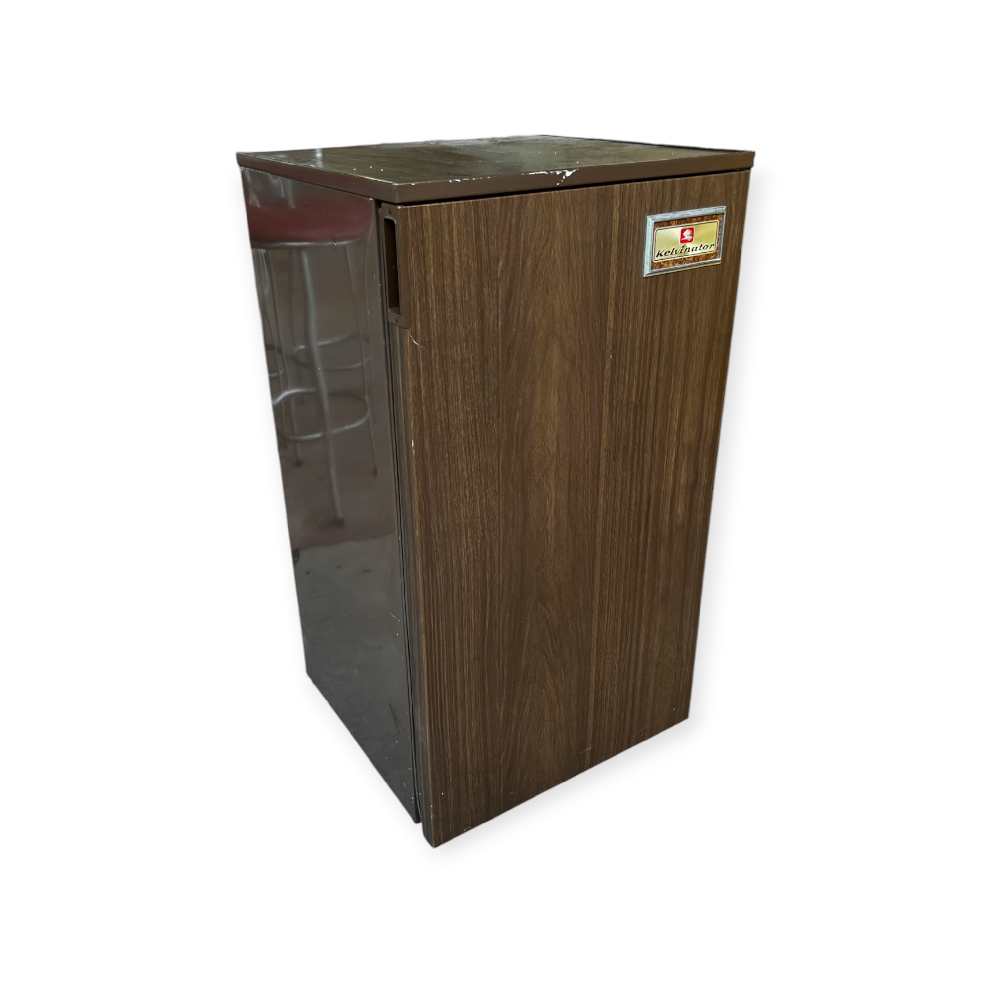 Frigobar vintage Kelvinator compacto, ideal para mantener bebidas y alimentos frescos. Importante: solo funciona el área del refrigerador; el congelador no está operativo. Una excelente opción para espacios reducidos a un precio accesible.