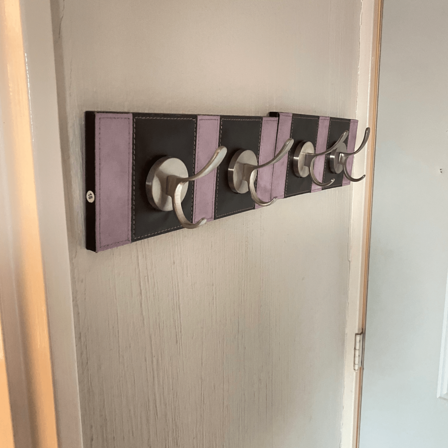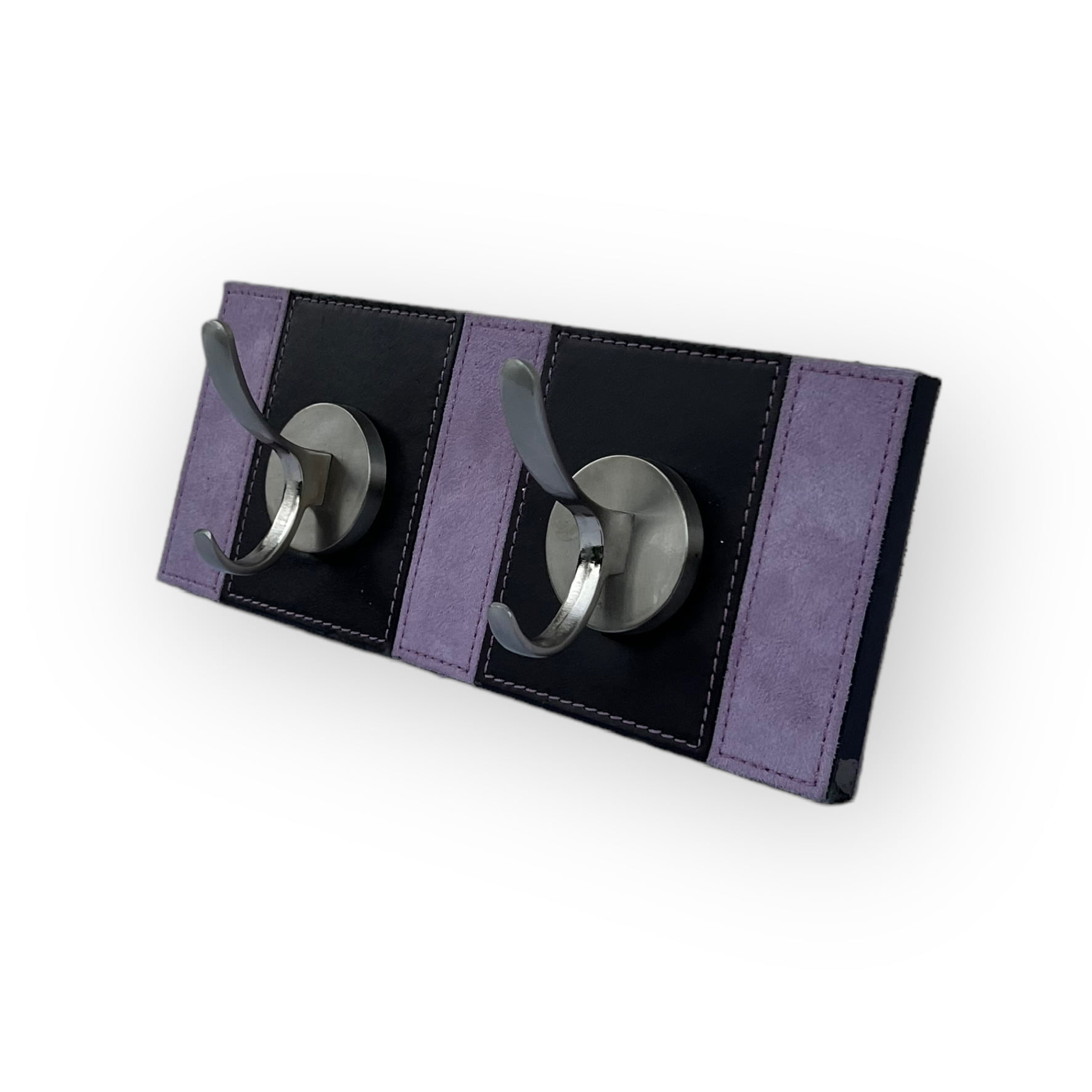 Mejora la organización y el estilo de tu entrada, dormitorio o armario con este moderno perchero de pared doble. Fabricado con materiales de alta calidad, presenta un diseño elegante y compacto con dos ganchos robustos sobre una base de color negro con detalles en púrpura. Cada gancho está diseñado para sostener varios artículos, lo que maximiza el espacio sin comprometer el estilo.